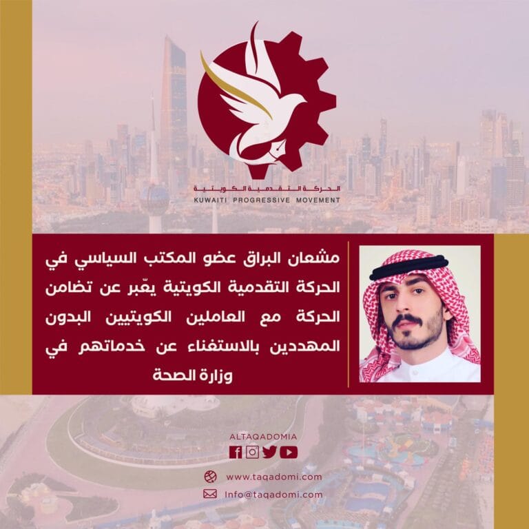 مشعان البراق عضو المكتب السياسي في الحركة التقدمية الكويتية يعّبر عن تضامن الحركة مع العاملين الكويتيين البدون المهددين بالاستغناء عن خدماتهم في وزارة الصحة