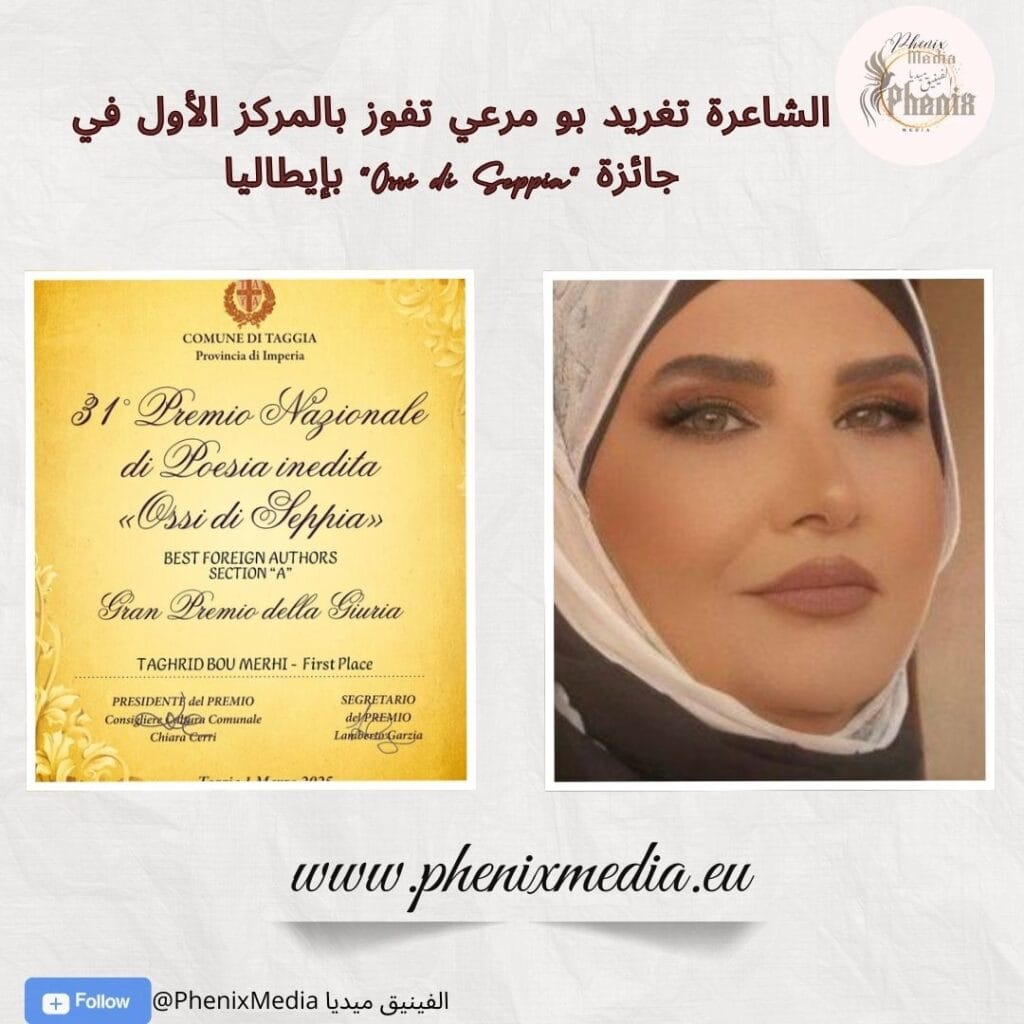الشاعرة تغريد بو مرعي تفوز بالمركز الأول في جائزة “Ossi di Seppia” بإيطاليا