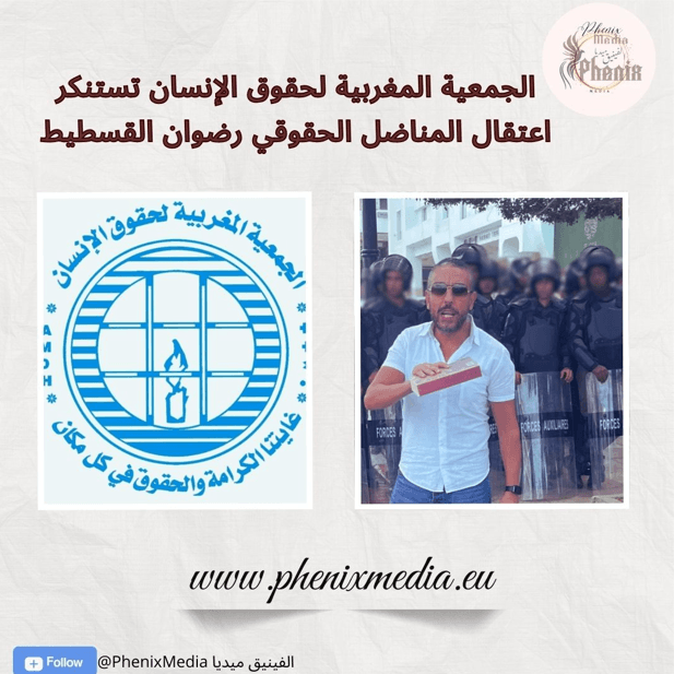 وعليه، فإن مكتب فرع الجمعية المغربية لحقوق الانسان ، يستنكر بأشد الاعتبارات اعتقال المناضل رضوان القسطيط، ويطالب بإطلاق سراحه فورا دون قيد او شرط وإسقاط المتابعة عنه ؛