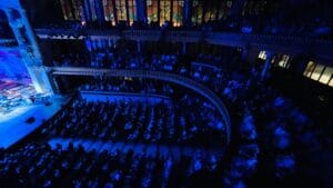 لكن اللحظة الأشد سحراً في الأمسية جاءت مع صعود فرقة أتروديل (Athrodeel) إلى المسرح، لتقدّم عملاً موسيقياً أصيلاً بعنوان “Love to Palestine”، مزج بين التراث الفلسطيني الغنائي والتوزيع الأوركسترالي الأوروبي، في تجربة فنية قلّ نظيرها.