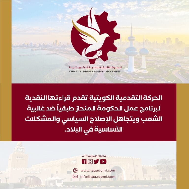 الحركة التقدمية الكويتية تقدم قراءتها النقدية لبرنامج عمل الحكومة المنحاز طبقياً ضد غالبية الشعب ويتجاهل الإصلاح السياسي والمشكلات الأساسية في البلاد. فبراير 8, 2024 إقرأ المزيد...